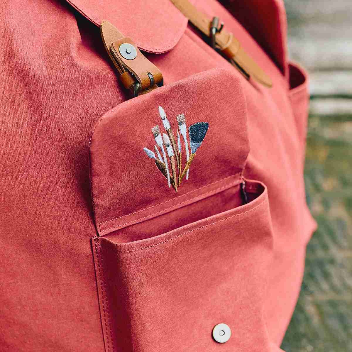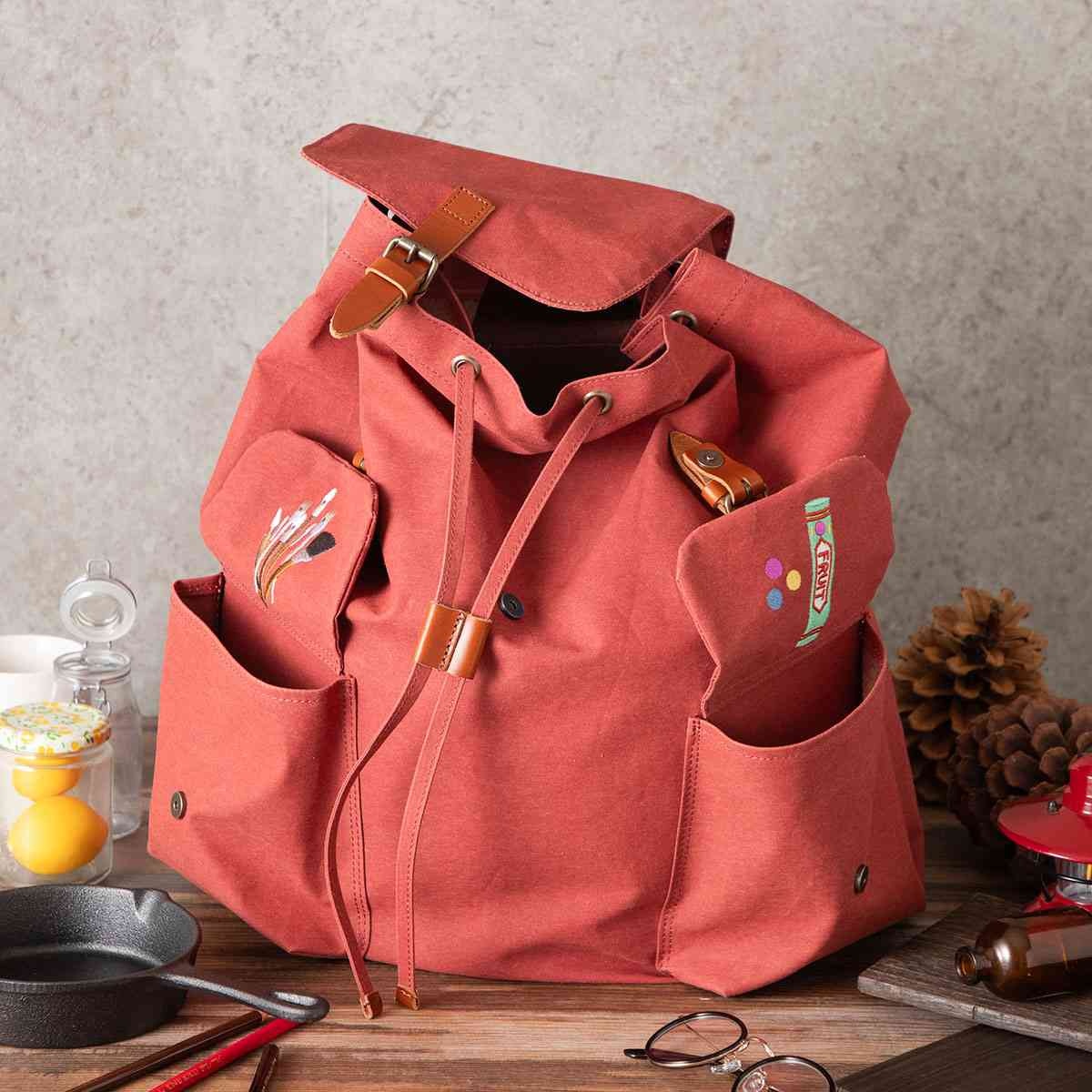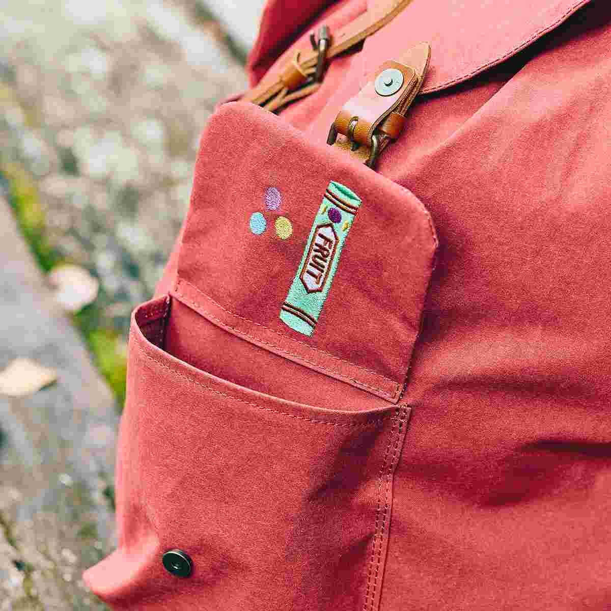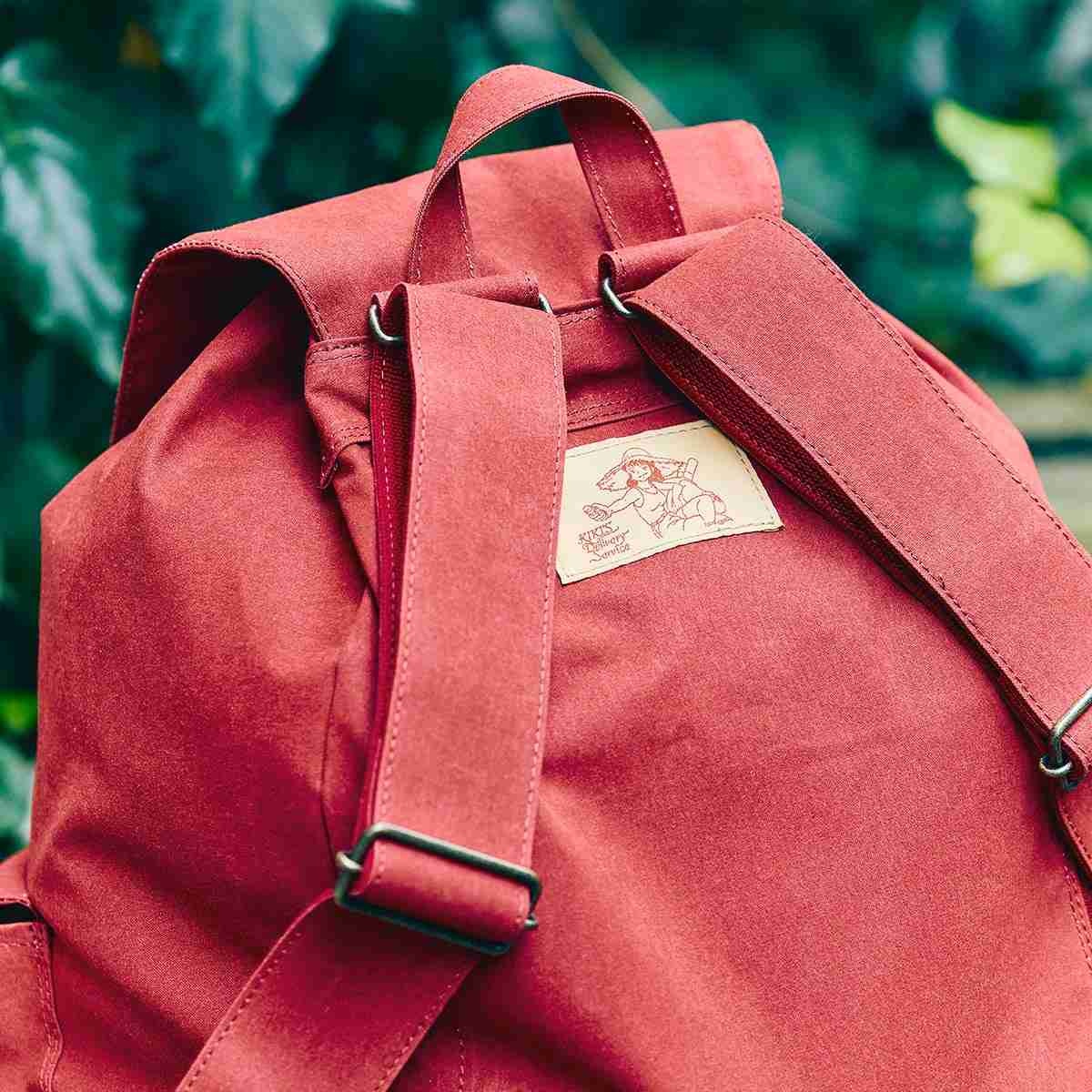 えんじ色の大容量のリュックは、テントなどで使用されている難燃性と耐水性に優れた生地で、タウンユースだけでなくアウトドアなシーンでも使用可能です。たくさんのものを収納できる、大きくぽってりとしたフォルムを再現するために、開口部は紐で開け閉めする構造のドローストリングを採用しました。両ポケットのフラップカバー裏の、右ポケットにはウルスラを彷彿とさせるガムの刺しゅうを、左ポケットにはたくさんの筆を施しました。さらに、リュックの背面上部には、作中でウルスラがキキにガムを差し出すシーンをデザインした織りネームをあしらいました。