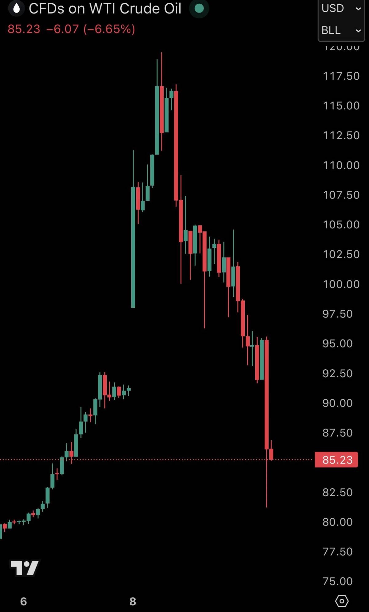 G7が備蓄を放出する報道があったから下がってきて今は80ドル台になってるよ