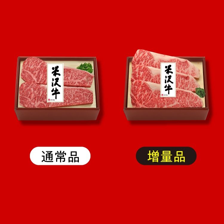 肉質にこだわり選び抜いた米沢牛をステーキ用で用意。霜降り鮮やかで柔らかな肉質のサーロインは、口の中に溢れる肉汁に甘みを感じられる。内容量を“なぜか45%”増量。