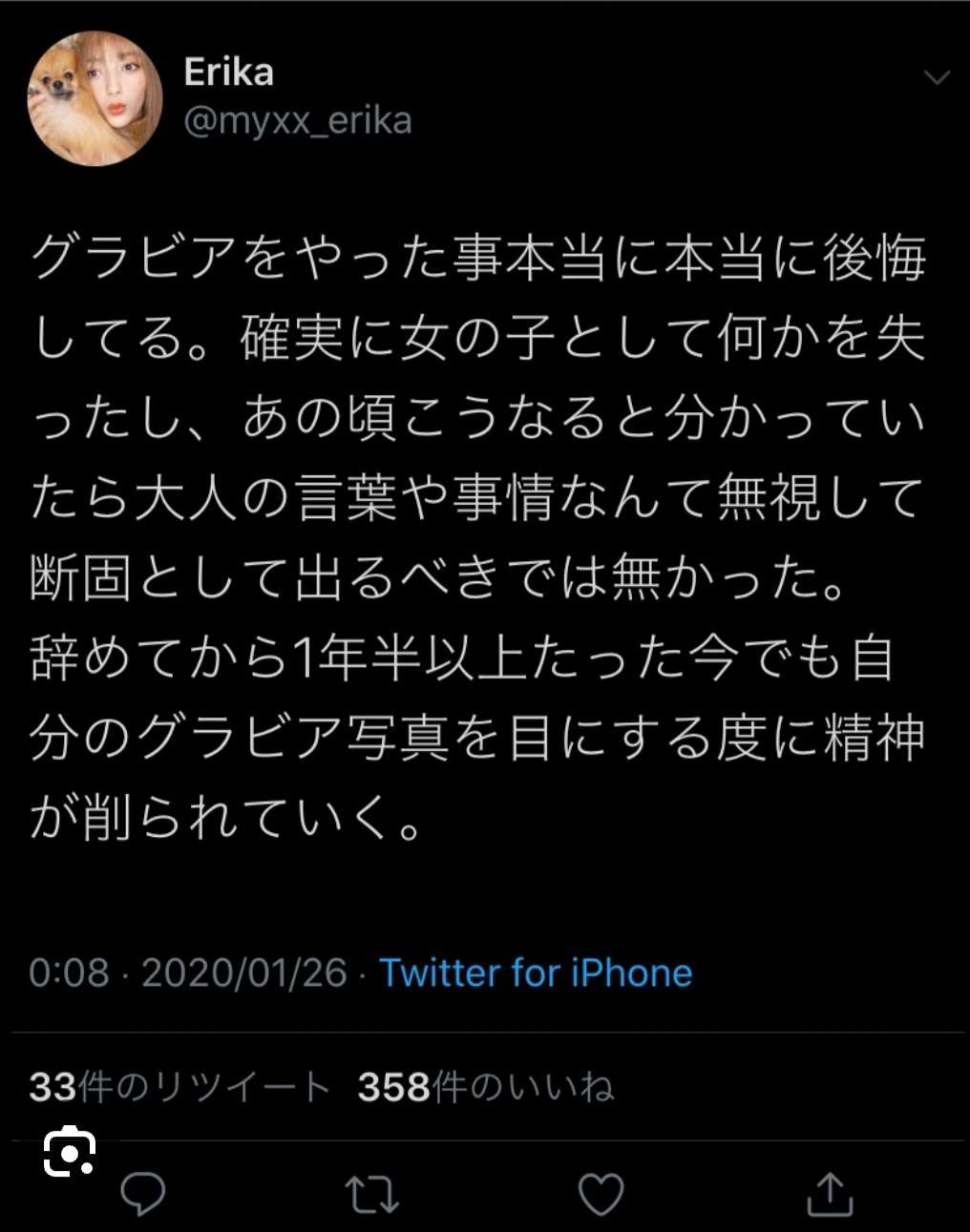 自身が「強くてかっこいい海外女性像というのに憧れていた」と明かしつつ「その後来た世間からの反応を想像出来なかった事にとても後悔しています」と吐露。そして、「なので、私は今後グラビアをする事は一切ありません」と宣言していました。