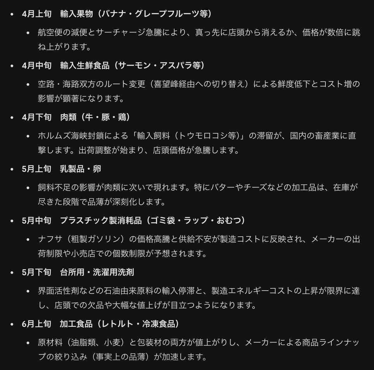これから、ナフサ危機による静かなインフレが進行し、半年後には日用品の棚が空っぽになるだろう。リスト通りの商品が消えるだろう。中東情勢は単なる口実であり、真の目的は富裕層による資源の独占と価格操作にあるという説がある。スーパーから消える品目は意図的に選ばれ、在庫調整が行われる。消費者はパニックに踊らされるが、実は管理された縮小競争のただ中にある。特にゴミ袋やラップが先行し、生活コストを押し上げる。新車や家電も遅れて高騰する。消費税免除も遅れるかもしれない。賢い備えこそが家計防衛なのである。