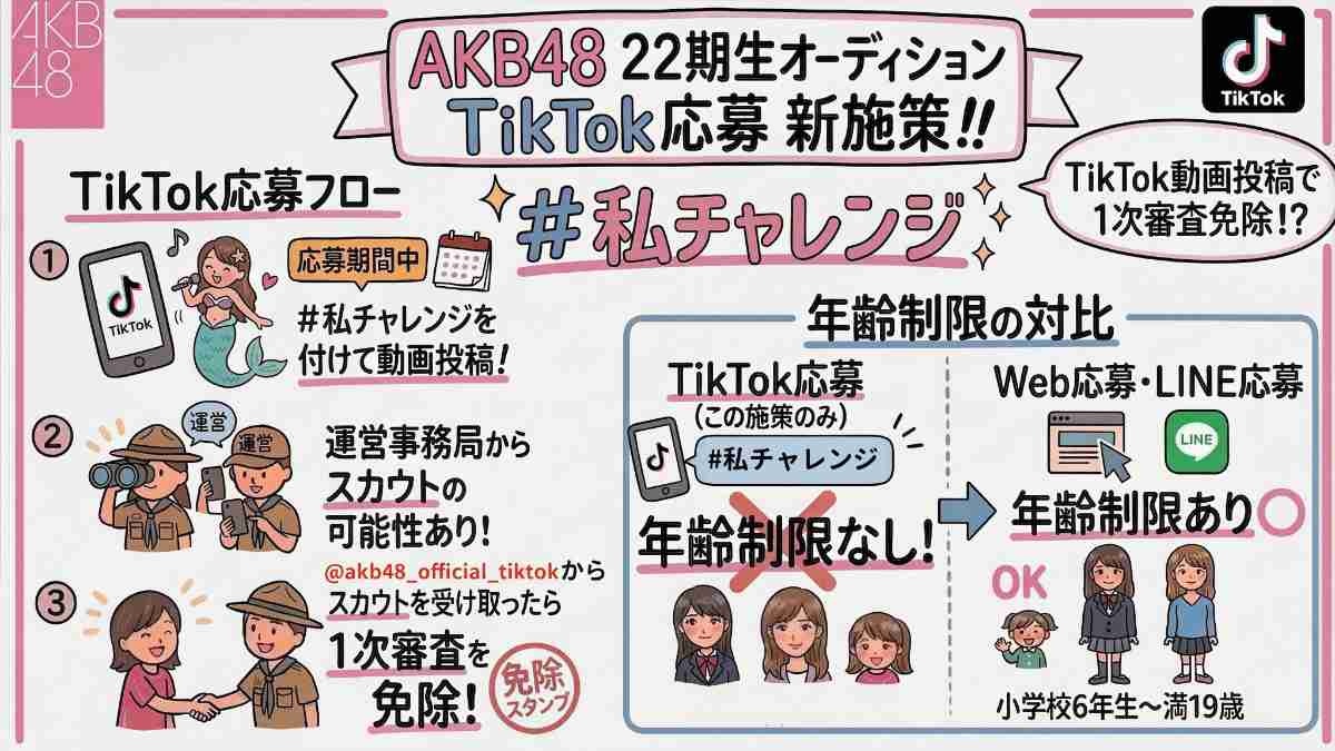 22期生オーディションでは、「TikTokスカウト枠」を新たに新設。年齢制限は無く応募は自身のTikTokアカウントから「#私チャレンジ」をつけて動画を投稿するだけ