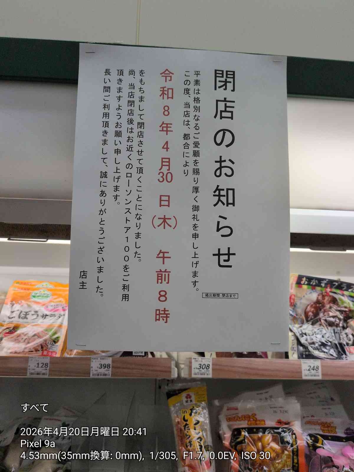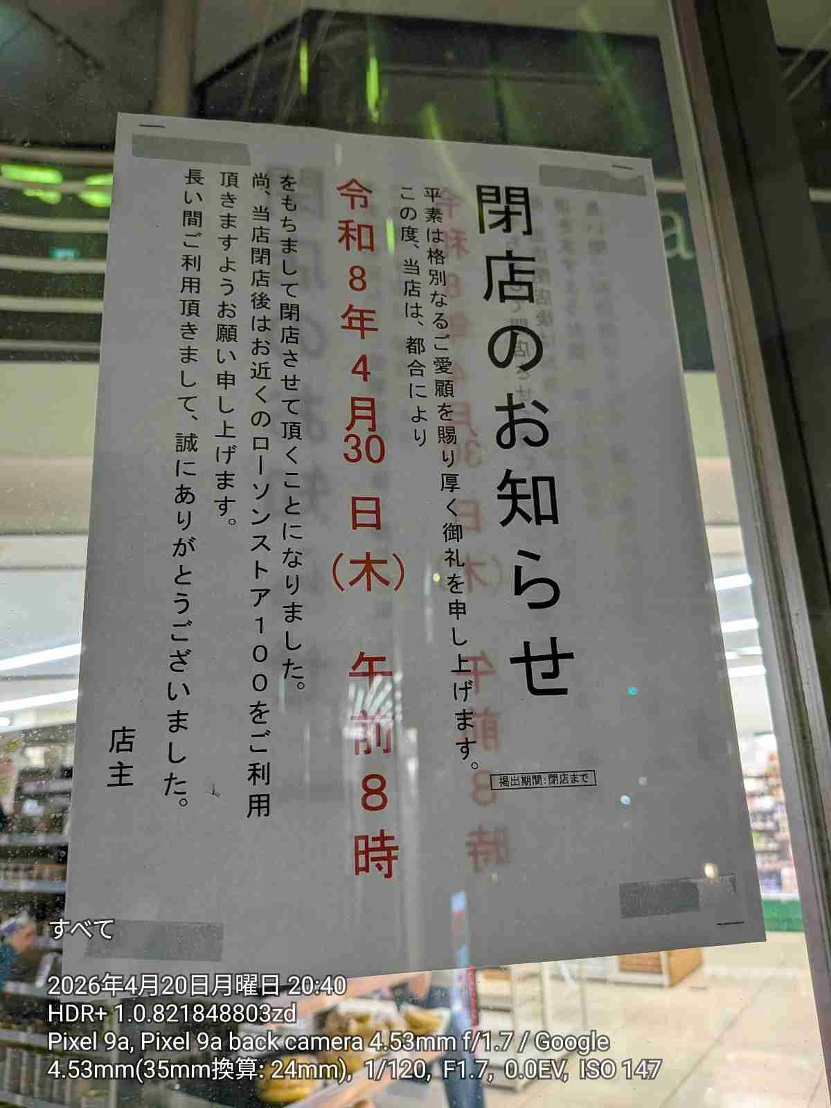 2026年4月15日ごろに実際に訪れてみると、店舗の入り口や店内には閉店のお知らせが掲示されていました。