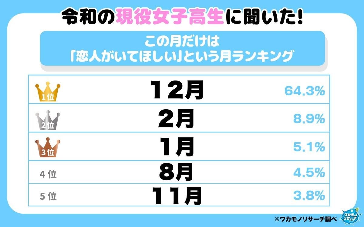 10代・現役高校生を対象としたマーケティング情報サイト「ワカモノリサーチ」は、全国の現役高校生(男女)に「この月だけは恋人がいてほしい月はいつですか?」とのアンケート調査を実施し、19日までに結果を発表した。