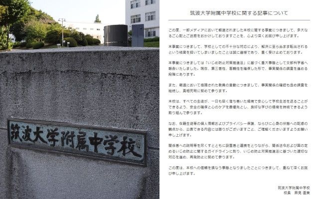創立130年を超える名門国立校・筑波大学附属中学校が、「週刊文春」が独自に報じていたいじめ問題を、「いじめ重大事態」と認定し、文部科学省に報告したことが分かった。4月24日、同校がHPで発表した。