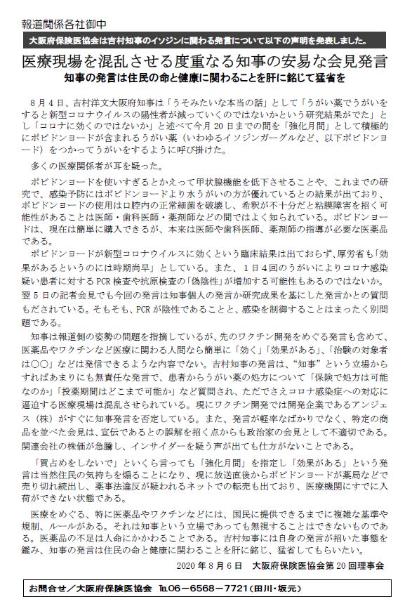 うがい薬問題。大阪府保険医協会声明は辛辣。