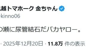 鬼越トマホーク・金ちゃん、尿管結石に罹患「この年の瀬にバカヤロー」にエール「最悪」「ドンマイ」「お大事に」
